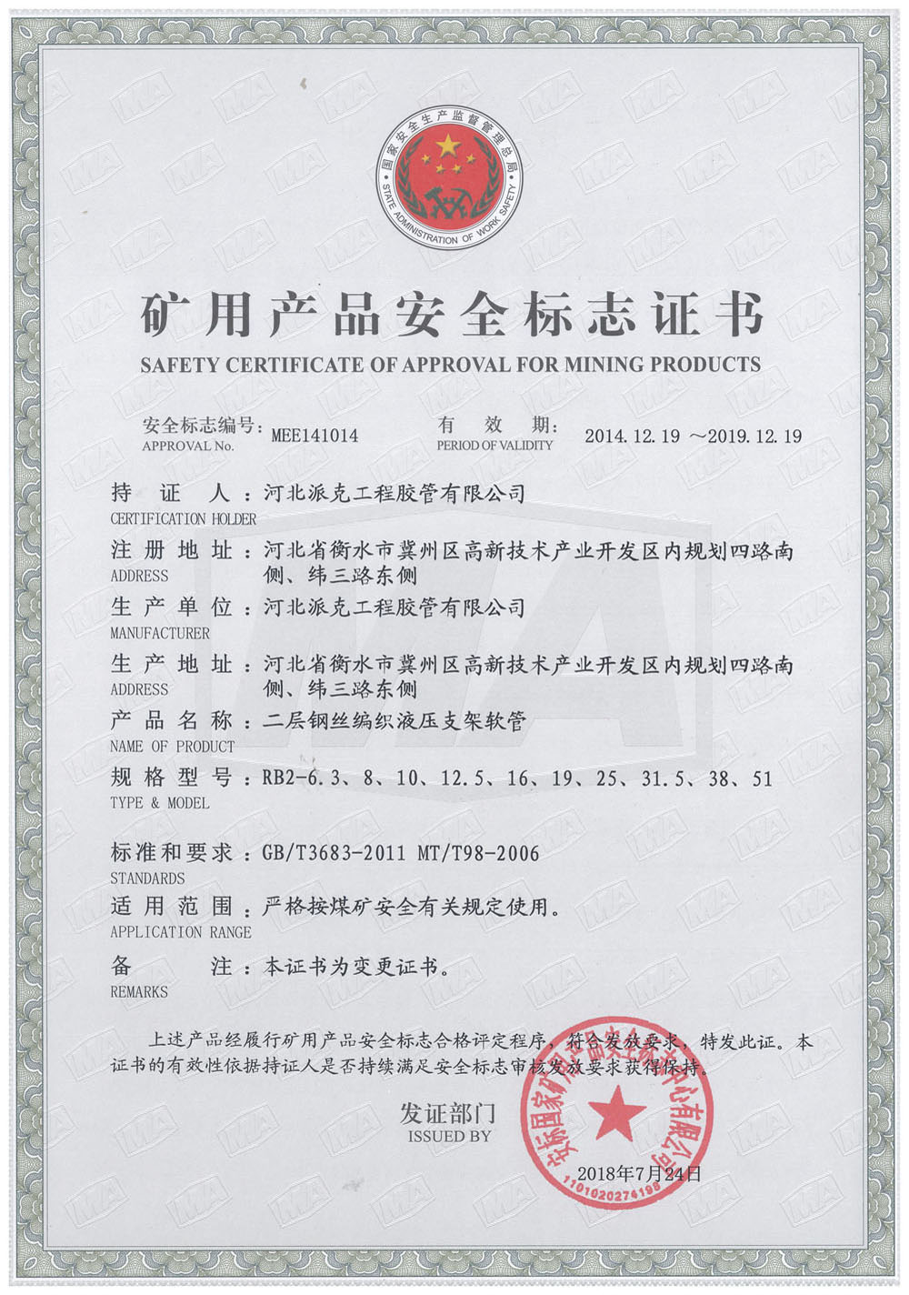 二層鋼絲編織液壓支架軟管證書(shū)